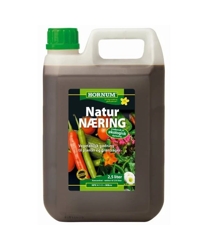 Hornum Natur Næring er en gødning der giver flotte blade, stærkere rodnet, flere blomsterknopper, og forøget smag i grønsager m.v, Hotnum Natur Næring kan bruges til økologisk jordbrug.