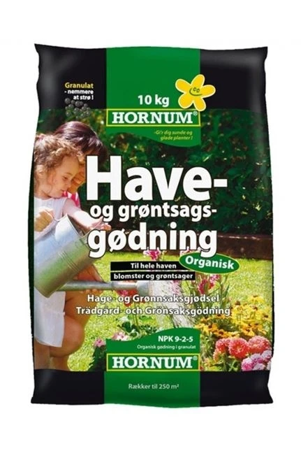 HORNUM Have- og Grøntsagsgødning er den ideelle grundgødning, som kan anvendes i hele haven. Den virker hurtigt og effektivt, og indeholder alle de næringsstoffer og micronæring som planten har behov for. Gødningen er i en ny granuleret form, som gør den nemmere at udstrø.