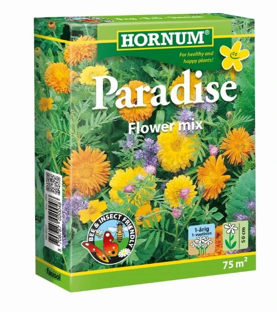 Perfekt blanding, som hurtigt får området til at se indbydende grønt ud for senere at stå i et farverigt blomsterflor. Sommerblomsterne byder på næring til mange insektarter og har desuden en dræbende effekt overfor skadelige nematoder. Blandingen består af 20% Morgenfrue, 6% Tagetes, 2% Kokarde, 10% Omvendt kløver, 10% Honningurt, 22% Blodkløver, 5% Almindelig hør, 15% Gul sennep og 10% Serradel. Efter såning holdes jorden fugtig, indtil spiringen er godt i gang. Trives i sol til halvskygge. Trives på de fleste jorde.