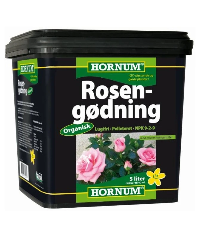 Roser kræver meget og har derfor brug for den rigtige gødning på de rette tidspunkter for at de kan blomstre flere gange på sæsonen. Hornum Rosengødning er langtidsvirkende eftersom nærnings stoffende frigives til rosens behov og derfor får rosen den præcise mængde nærning den har brug for i en hel vækstperiode.